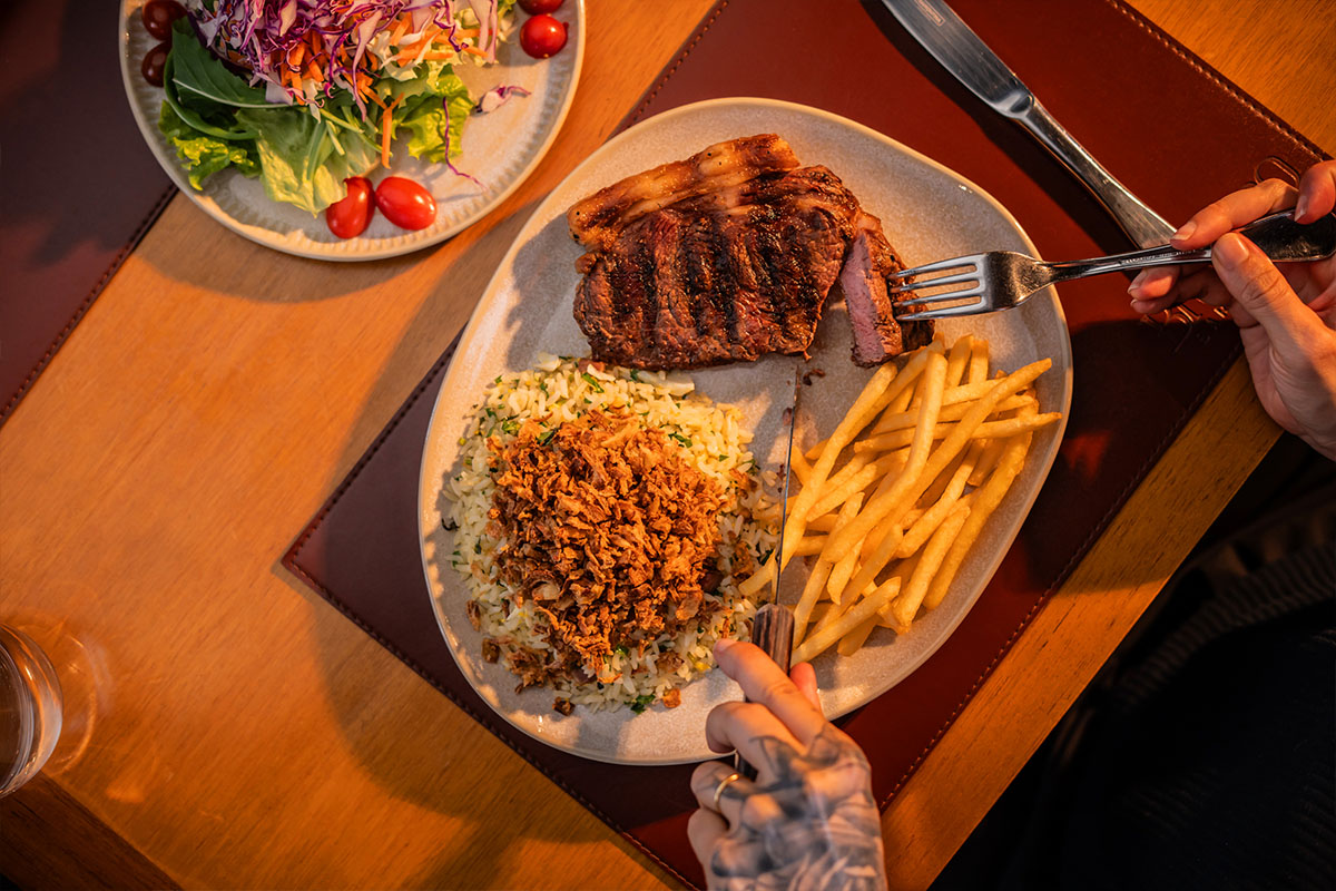 1 Steak de prime rib Acompanha arroz, fritas, vinagrete e cebolete.