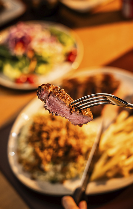 Parmegiana de Filet Mignon de Angus. Acompanha arroz branco e fritas.