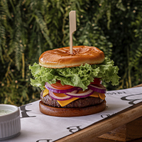 Hambúrguer Angus de 210g, queijo mussarela, tomate, alface e cebola roxa com molho secreto no pão com gergelim.